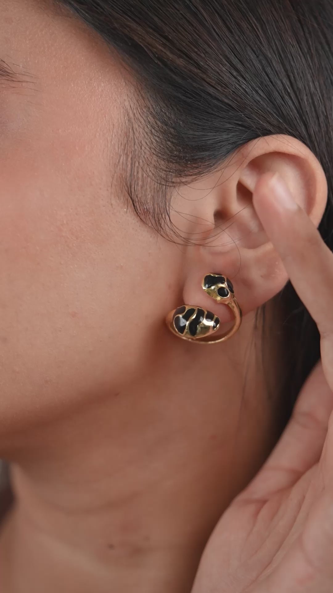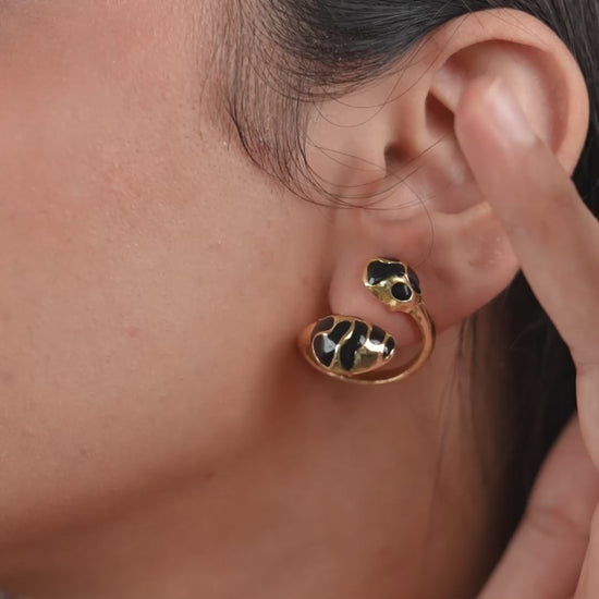 Whisper-soft yet bold, these 22ct gold plated black enamel hoops glow under moonlight. Ideal with sleek ponytails, red lips, and rooftop nights. |