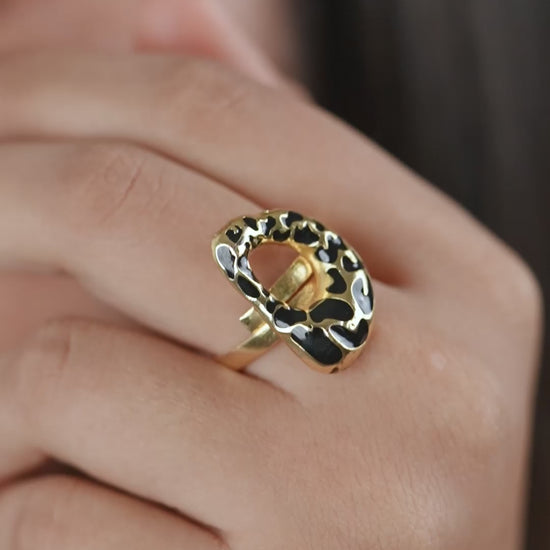 Big, bold, unstoppable —this 22ct gold plated black enameled brass ring is perfect for club nights and statement hand poses.