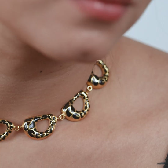 Daring yet refined — this 22ct gold plated black enamel striking necklace commands attention with minimal effort and maximal style. |