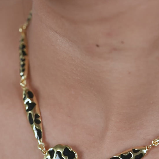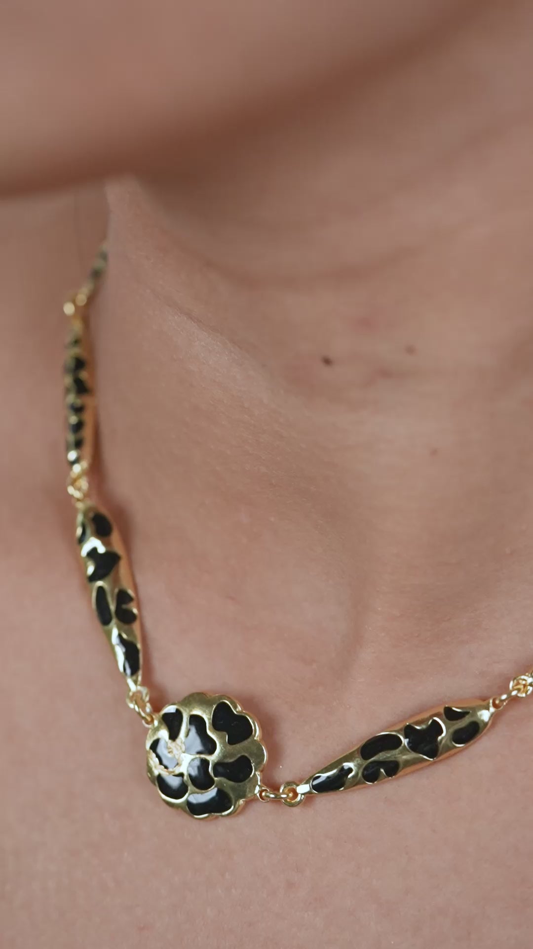 Radiating quiet fire — this 22ct gold plated bold enameled piece layers effortlessly over low necklines and golden-hour confidence. |