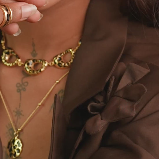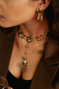 Wrap up the night —with this bold and sleek 22ct gold plated black enameled brass bracelet, it adds wild-city confidence to every wrist flick. |