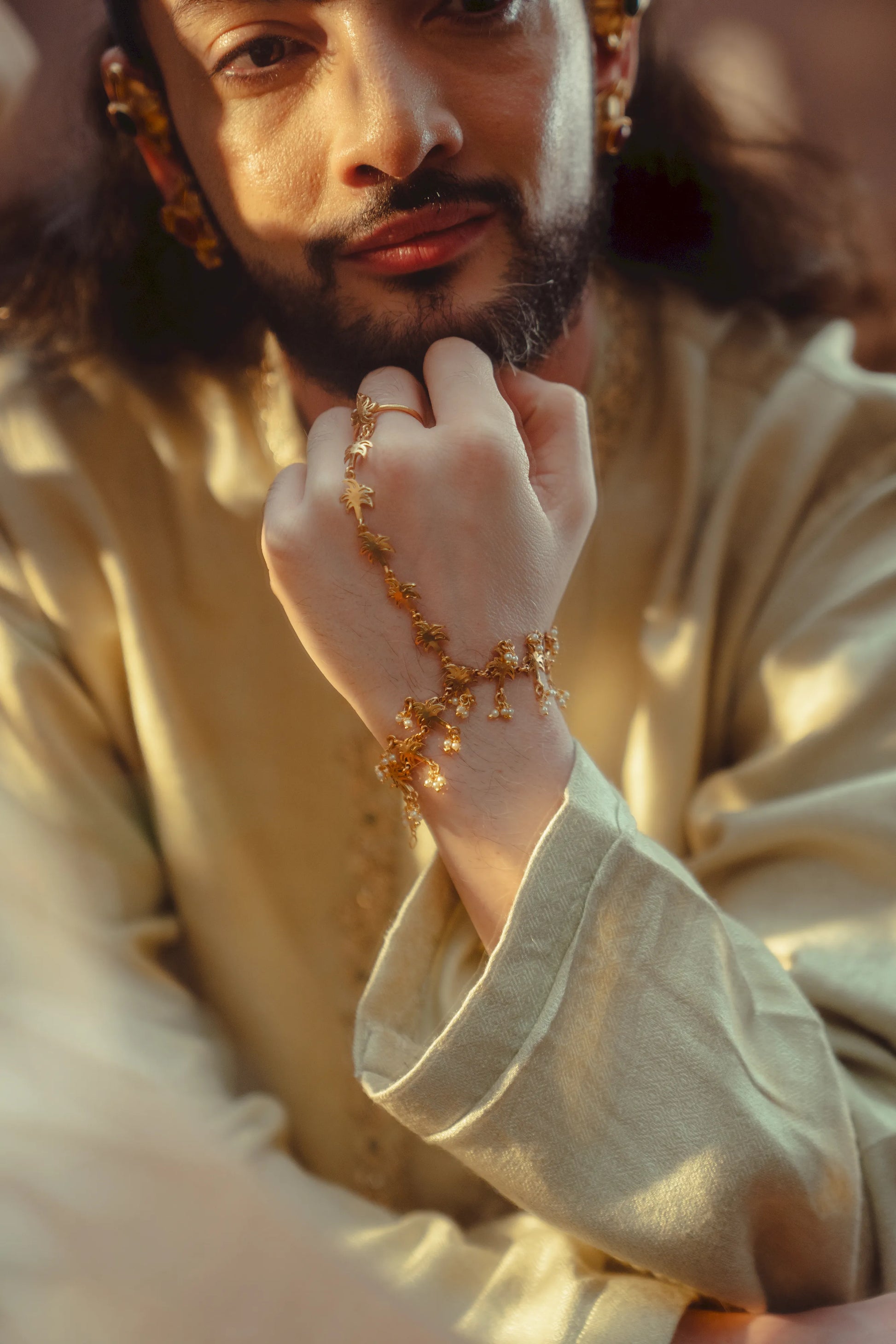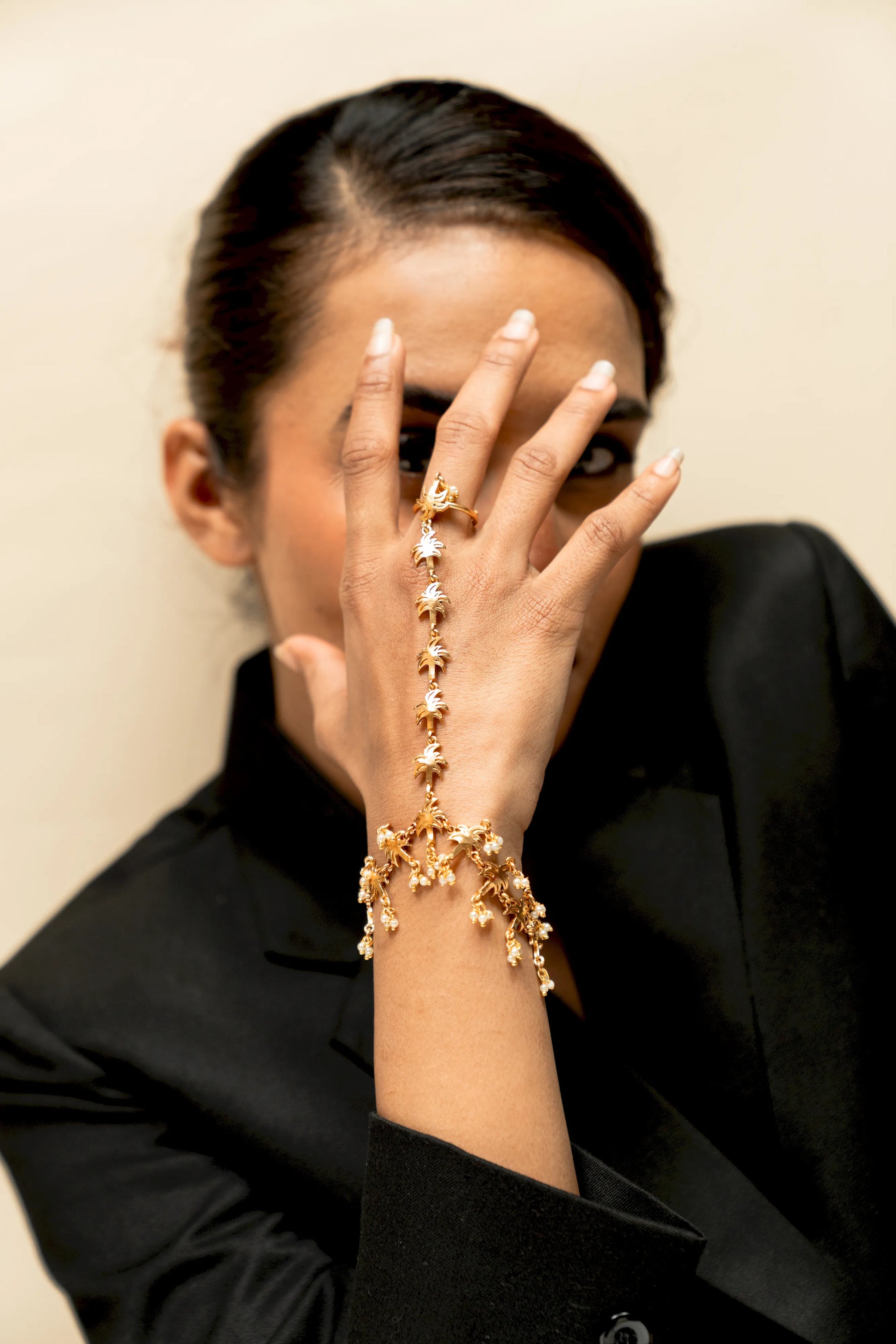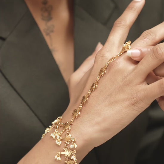 | Mudra Leher Haathphool flows across the hand with quiet grace. The floral centre connects to the wrist through delicate chains, creating movement in every gesture. A beautiful accent for mehendi and wedding ceremonies. |