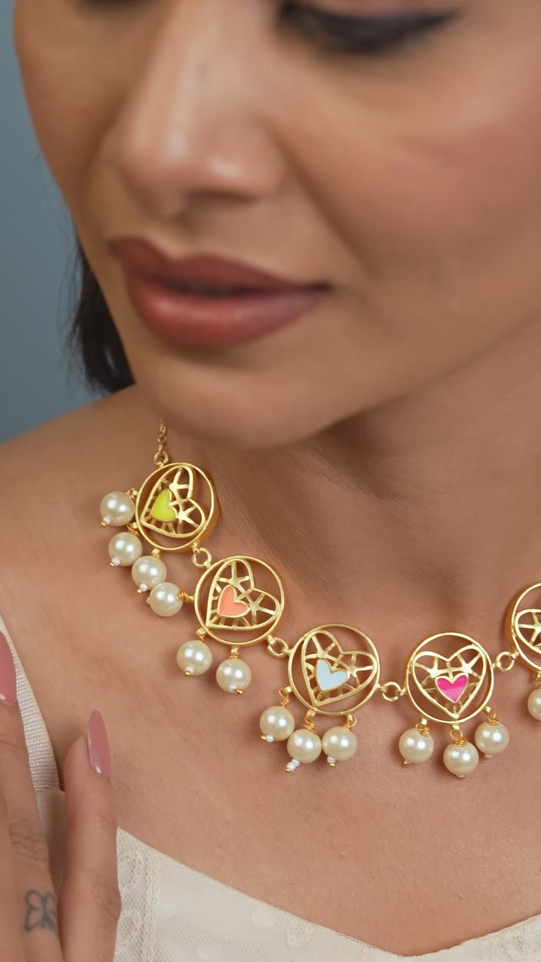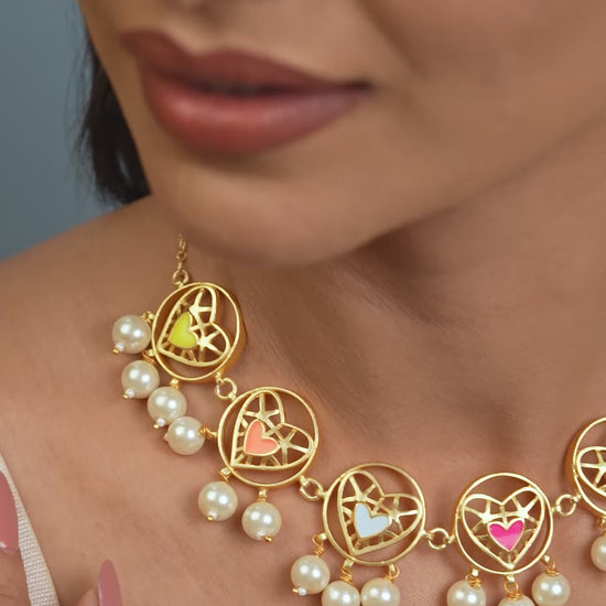 | The Longest Hug Necklace showcases hand‑crafted 22ct gold‑plated brass, vibrant multicolor enamel detailing, and a Gen‑Z boldness vibe. Designed for made for romantic moments, parties and festive styling, this piece adds expressive charm, color, and personality to every look. |