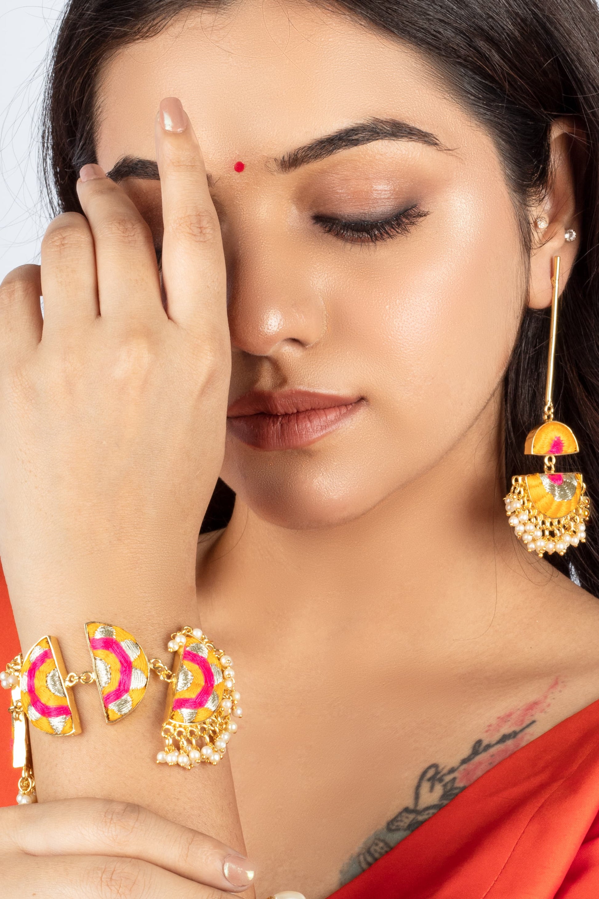 Add a splash of sunshine to your wrist with the Golden Glow Bracelet, featuring mustard yellow and pink embroidery and adorned with pearls. This 22ct gold-plated bracelet is perfect for haldi or roka functions, bringing warmth and vibrancy to any outfit.