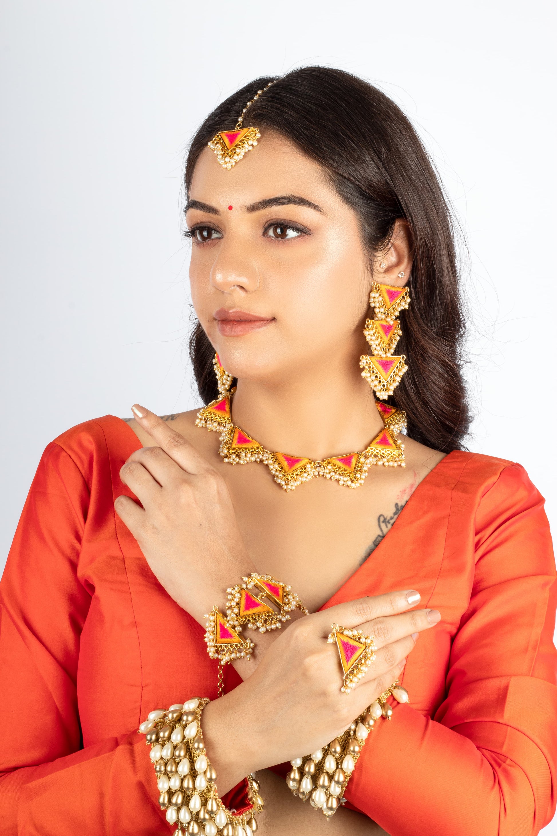 The Golden Petal Maang Tikka combines mustard yellow and pink embroidery with pearls for a look that’s both bold and feminine. This piece is an elegant choice for sangeet or roka events. Pair it with a matching outfit to let this vibrant accessory truly shine!