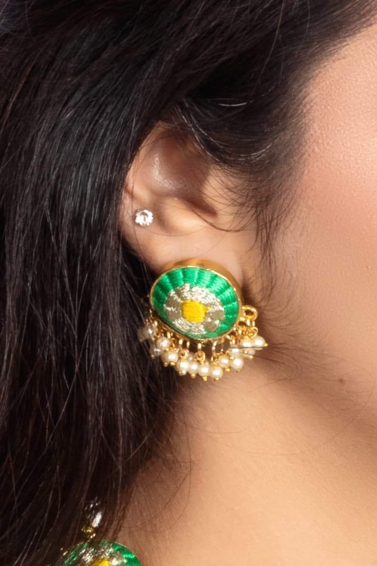 Fresh and trendy, the Citrus Bloom Drops feature lime green and yellow silk thread embroidery with pearl details i 2ct gold-plated brass frame. Perfect for haldi or daytime functions, these earrings will elevate your look with minimal effort.