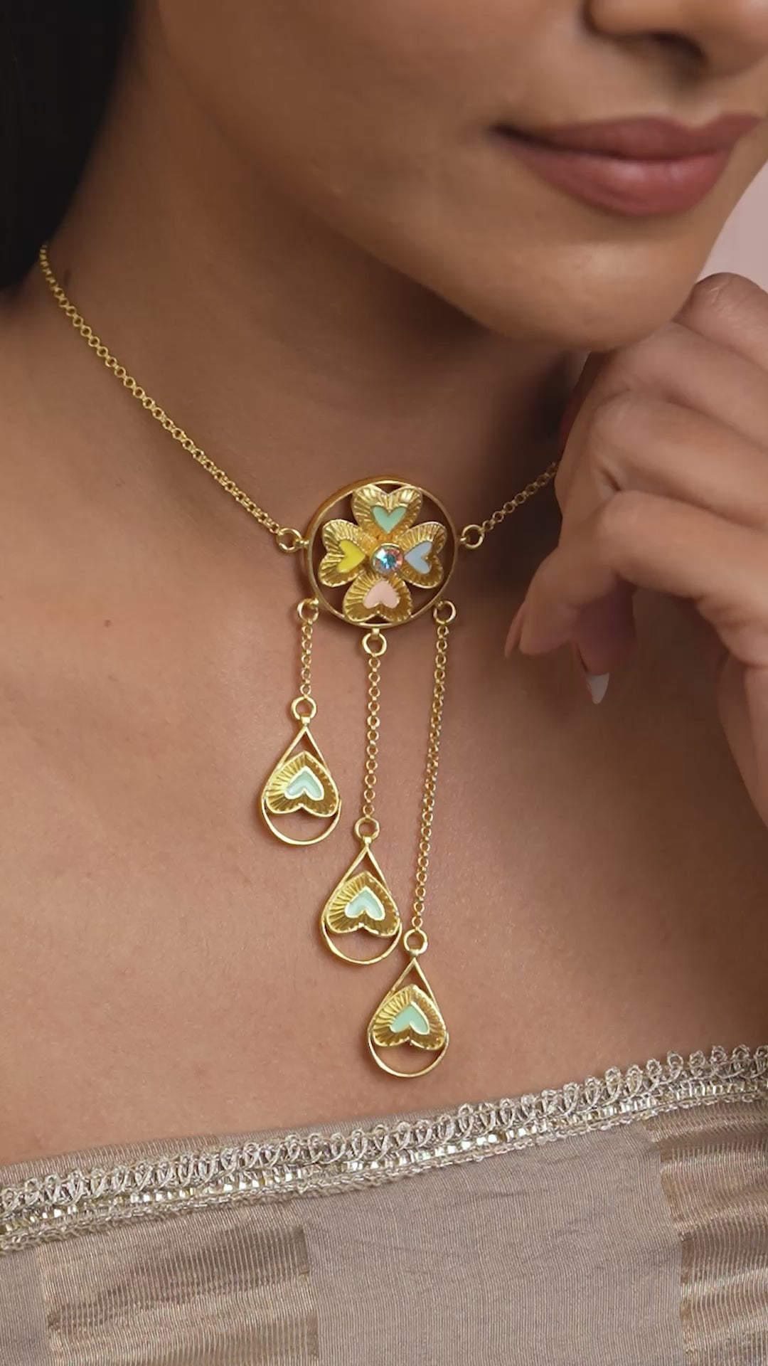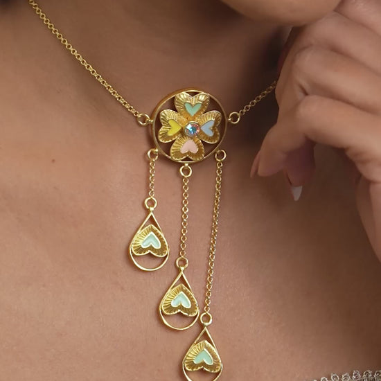 | All My Tomorrows Necklace showcases premium Swarovski crystals, vibrant multicolor enamel detailing, and a cinematic romance vibe. Designed for perfect for weddings, date nights and celebrations, this piece adds expressive charm, color, and personality to every look. |