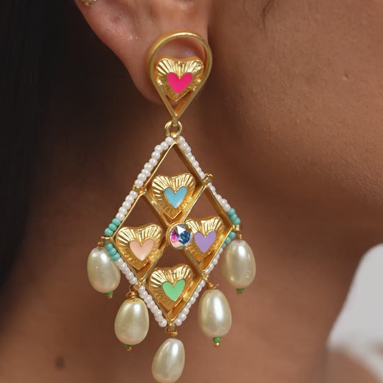 | Something About You Earrings showcases lightweight feel with high shine, hand‑crafted 22ct gold‑plated brass, and a whimsical couture energy vibe. Designed for made for romantic moments, parties and festive styling, this piece adds expressive charm, color, and personality to every look. |