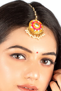 Bring warmth to your festive look with the Sunrise Bloom Tikka, a blend of pink and mustard yellow embroidery, accented with a delicate pearl. Perfect for mehendi or haldi ceremonies, this tikka captures the joy of celebration. Style it with matching jhumkas for a lively, colorful vibe.