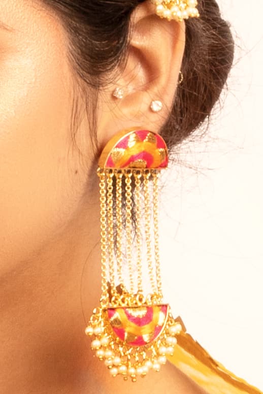 Let your style shine with the Sunshine Blush Tassel Earrings, a vibrant combo of mustard yellow and hot pink embroidery, finished with pearls. These long danglers are perfect for mehendi events or haldi ceremonies, adding a fun, festive touch to your outfit. Pair them with a bright lehenga or saree for an effortlessly chic look.